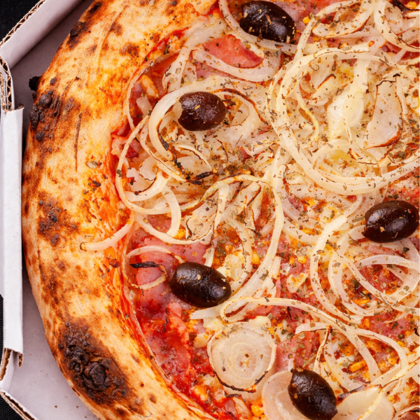 Linguiça Calabresa Farta Sobre Muçarela Derretida, Cebola Levemente Assada e Azeitonas Pretas, Com Massa Maturada Crocante. Tradicional, Forte e Irresistível
