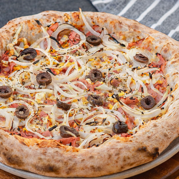 Lombinho Canadense Macio Sobre Muçarela Derretida, Azeitonas Verdes Finalizando, Com Massa Maturada Crocante. Suave, Cremosa e Muito Saborosa