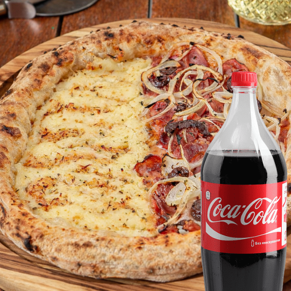 Pizza Grande Com 8 Fatias Bem Servidas, Massa Maturada Mais Crocante e Recheio Generoso, Acompanhada de Coca-Cola Original 1,5L Bem Gelada. Combo Perfeito Pra Matar a Fome