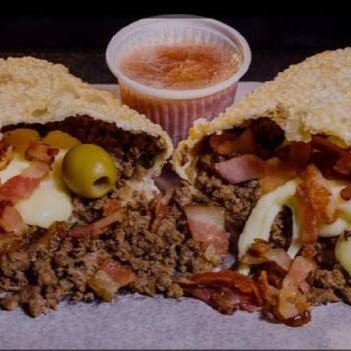 Pastel De 120 Gramas De Carne, Bacon ,milho, Azeitona E Cheddar ,mais Saladinha