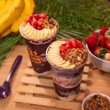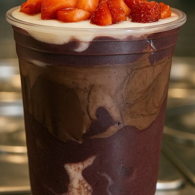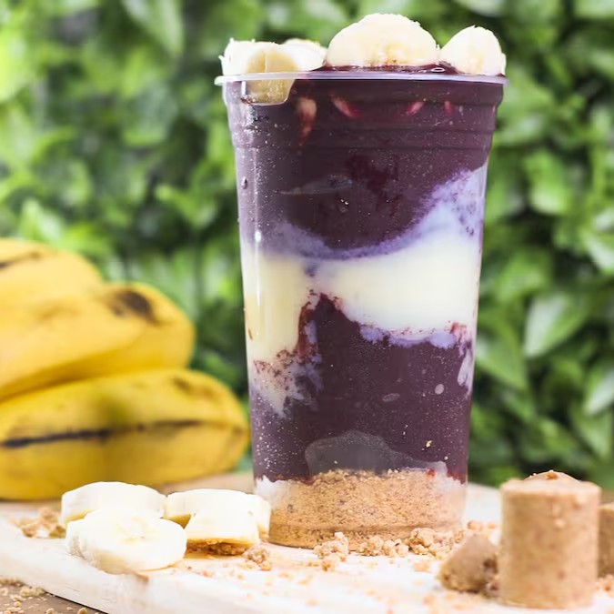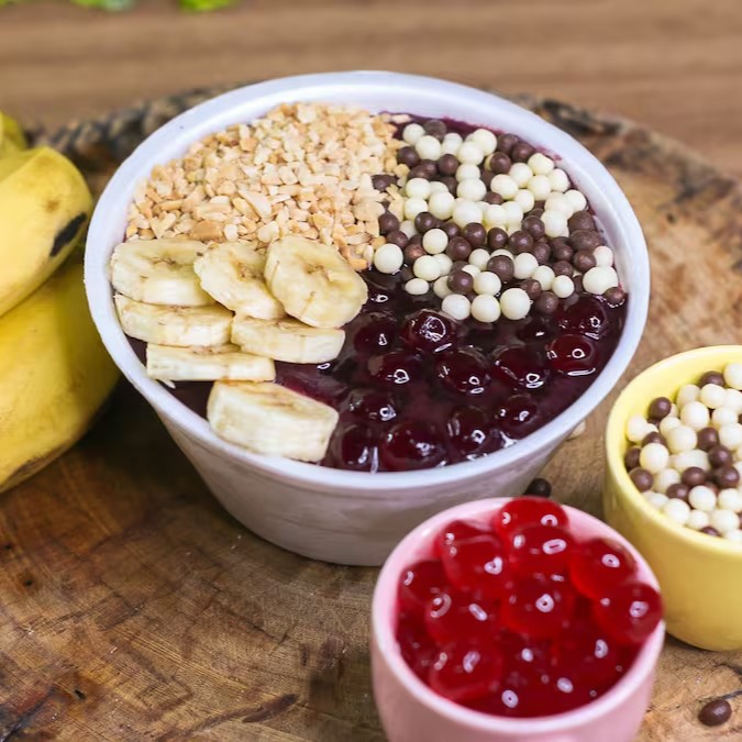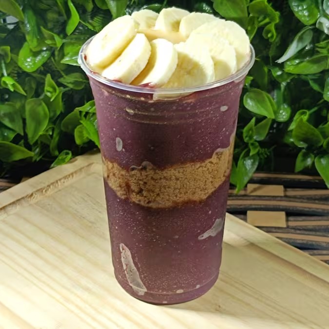Açaí cremoso servido no copo de 300ml, combinado com leite condensado, banana e paçoca, criando um equilíbrio perfeito entre doçura e textura.