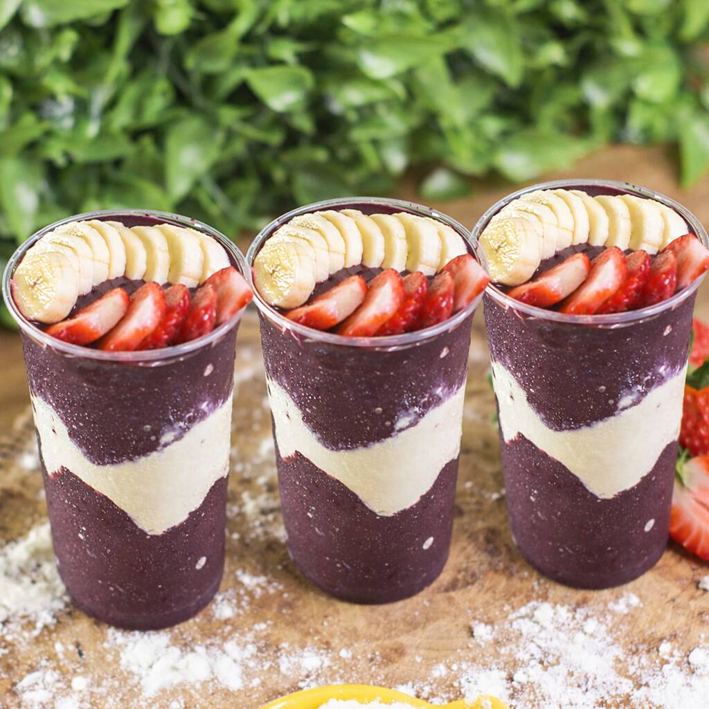 São 3 copões de 300ml de açaí cremoso, ideais para compartilhar. Escolha 3 adicionais e aproveite 20% OFF.