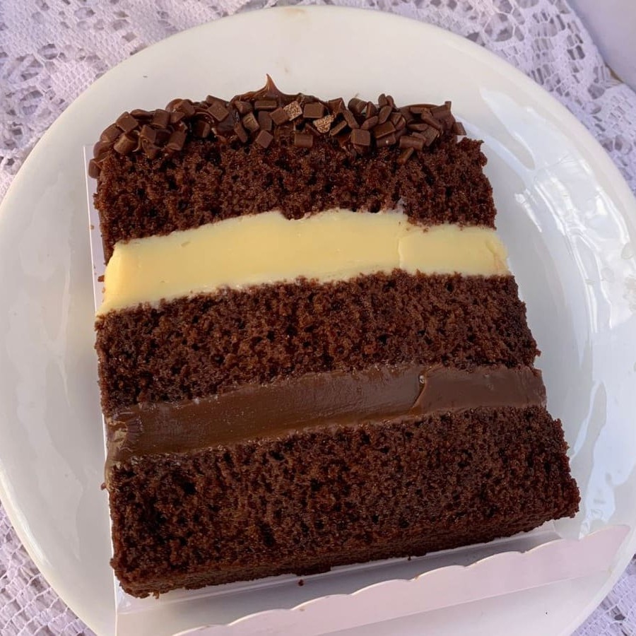 Uma fatia de bolo com a massa de chocolate úmida e macia, recheada com um brigadeiro gourmet de chocolate cremoso e brigadeiro de leite Ninho.