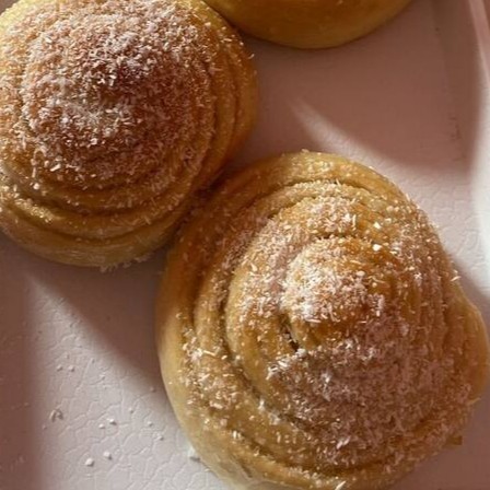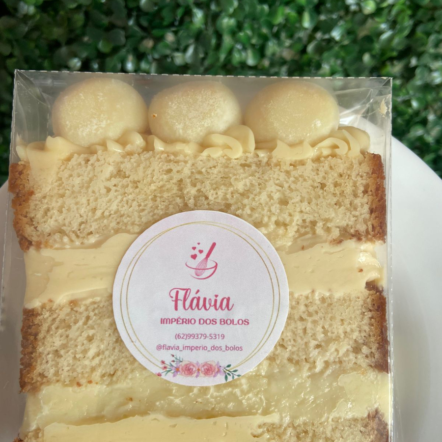Uma fatia de bolo com a massa de baunilha úmida e macia, recheada com brigadeiro de leite Ninho e coco.