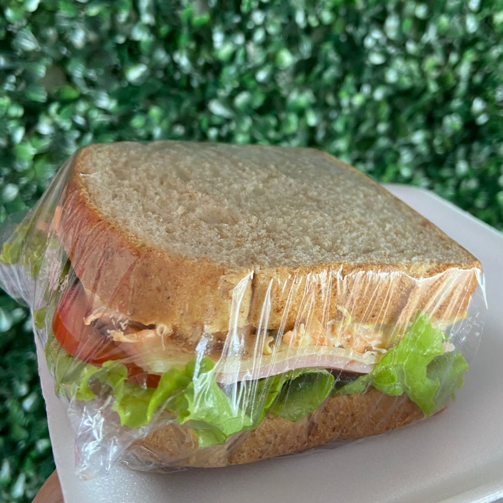 Pão integral com recheio de patê de frango (frango desfiado com cenoura, azeitona, requeijão light e maionese light) presunto, mussarela, alface e tomate.