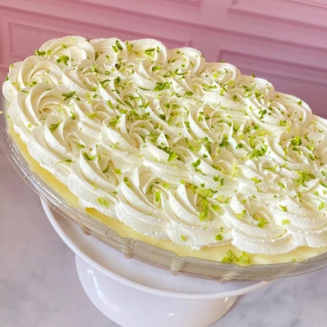 Farofinha de bolacha amanteigada, mousse de limão do suco de limão finalizado com chantilly e raspa de limão. Serve até 10 pessoas. Quantidade em media 1.700 a 2 litros