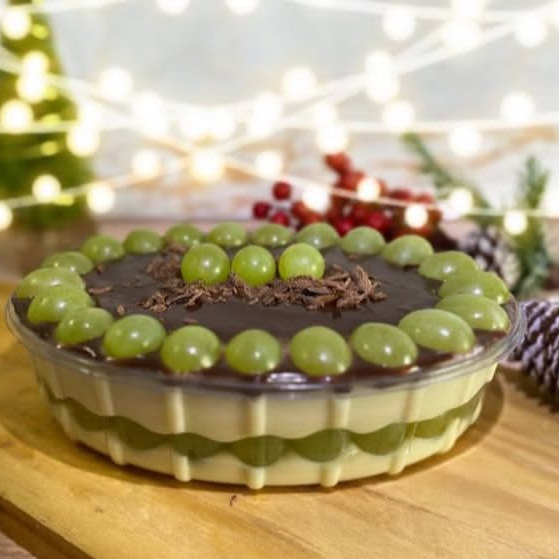 Brigadeiro branco com um delicioso mousse de leite ninho e uvas finalizado com brigadeiro cremoso de chocolate e mais uvas. Serve até 10 pessoas