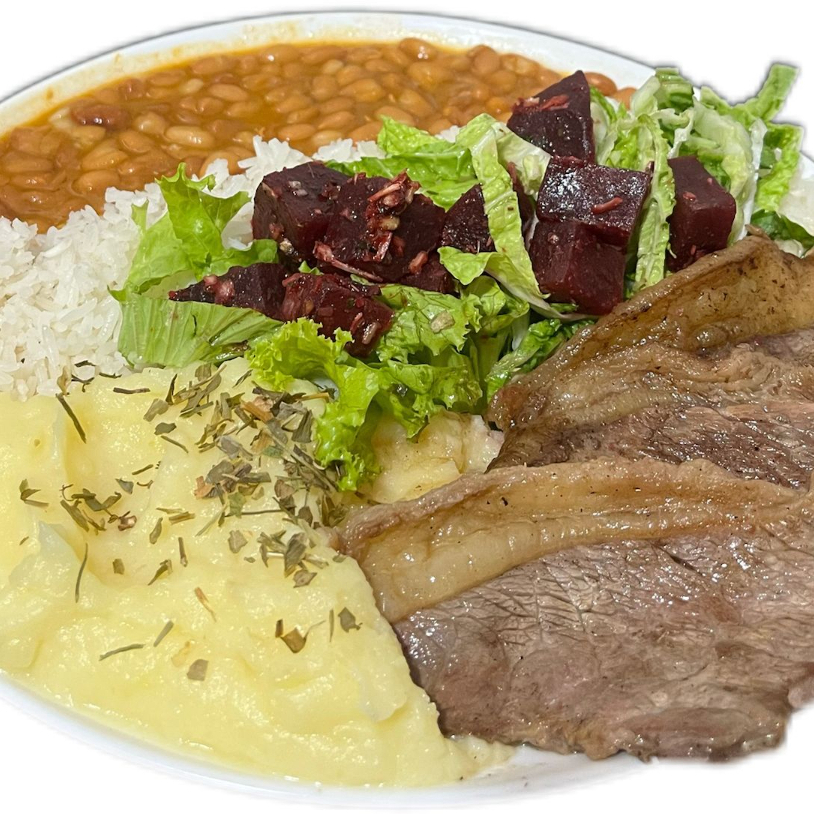 Suculento Bife de Maminha (com cerca de 180 g) assado no grill, servida com arroz branco, feijão de caldo, guarnição do dia (que pode ser purê de batatas ou batata frita) e salada fresca do dia.