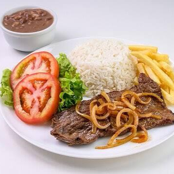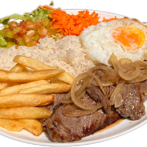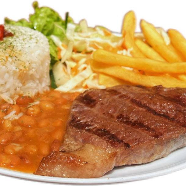 Bife de colchão mole servido com ovo frito. Acompanha arroz branco soltinho, feijão de caldo, batata frita e salada fresca do dia. Guarnição do dia (a depender do dia será purê de batata ou batata frita - sendo palha ou chips)