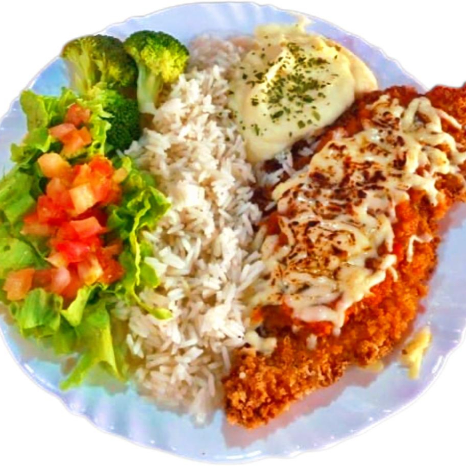 Filé de frango empanado na farinha panko, servido com molho de tomate fresco da casa e queijo mussarela massaricado. Acompanha arroz branco, purê de batata e salada fresca do dia. Guarnição do Dia (a depender do Dia será purê de batata ou batata frita - sendo palha ou chips)