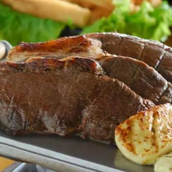 Picanha assada no grill, servida com arroz branco, feijão especial do dia, batata frita e salada fresca do dia. Guarnição do Dia (a depender do Dia será purê de batata ou batata frita - sendo palha ou chips)