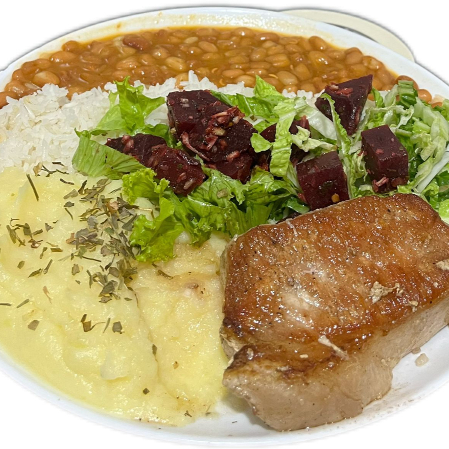 Lombo assado no grill, servido com arroz branco, feijão especial do dia, batata frita e salada fresca do dia. Guarnição do dia (a depender do dia será purê de batata ou batata frita - sendo palha ou chips)