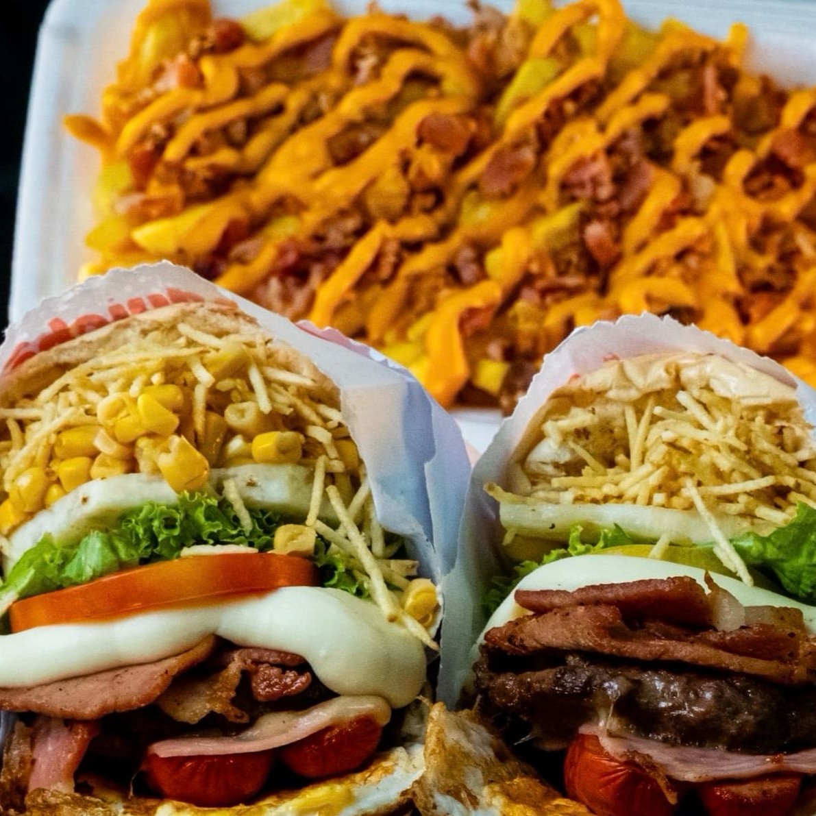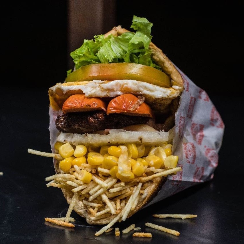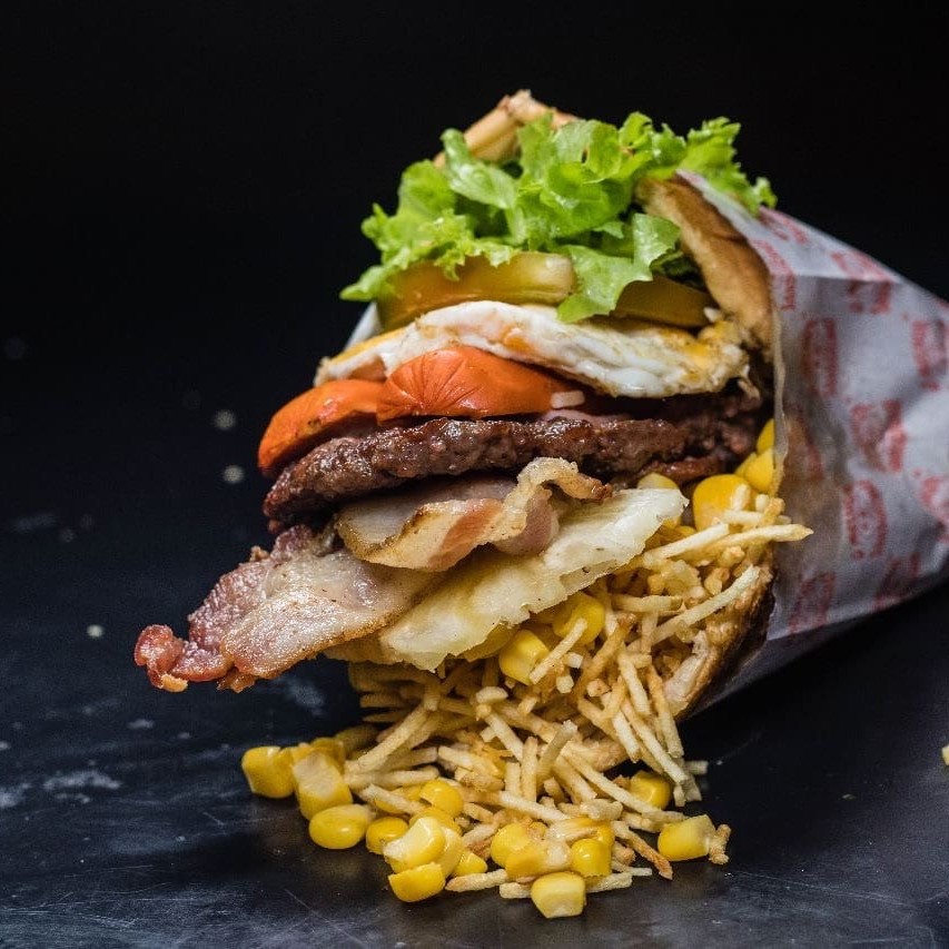 Pao com gergelim, hambúrguer, ovo, presunto, mussarela, tomate, milho, batata e abacaxi