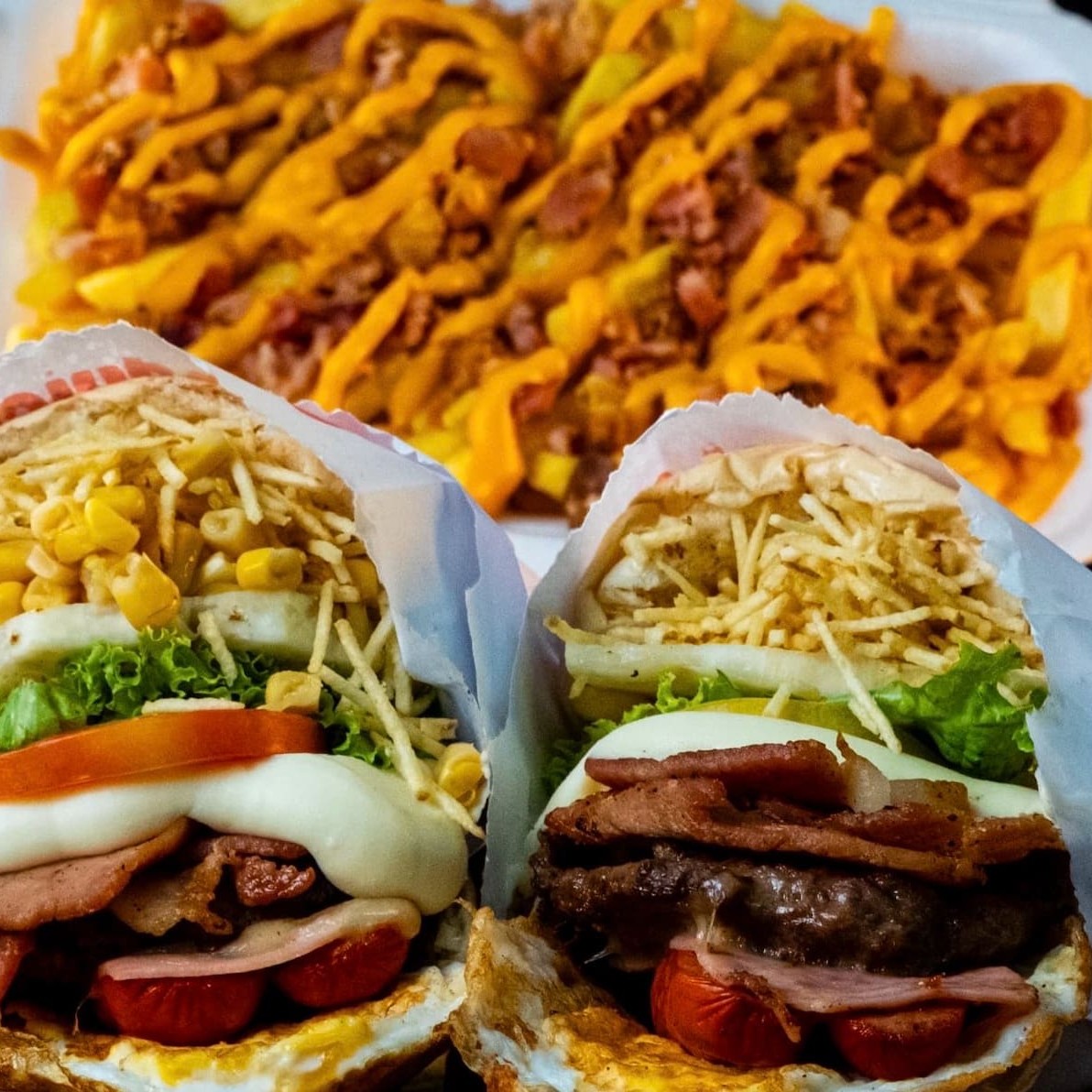 Pao especial, hambúrguercaseiro, filé de frango, bacon, ovo, salsicha, presunto, mussarela, tomate,alface, milho, batata e abacaxi