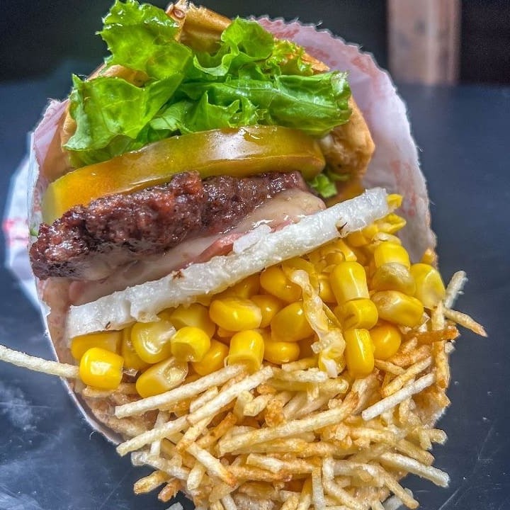 Pão com gergelim, hambúrguer, presunto, mussarela, tomate, milho, batata e abacaxi