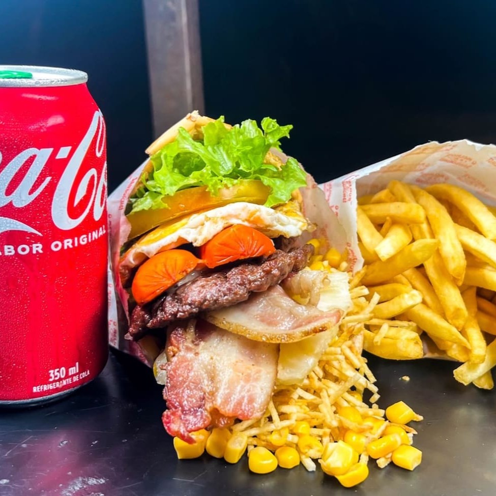 X-Tudão com pão de gergelim, hambúrguer, bacon, ovo, salsicha, presunto, mussarela, tomate, milho, batata palha e abacaxi. Acompanha batata frita P e Coca-Cola 350ml. Peça já na Foguim Sanduicheria!