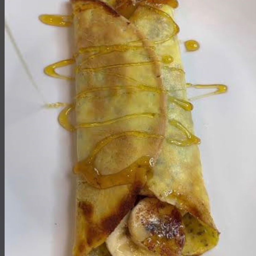 Tapioca recheada com fatias de banana e polvilhada com canela, perfeita para amantes de doce.