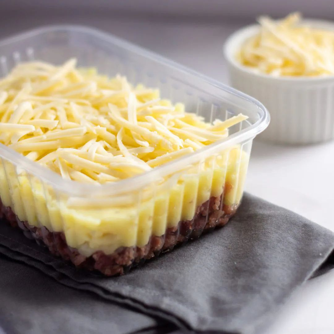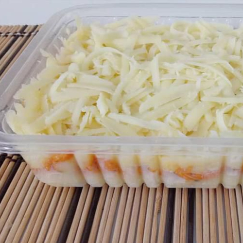 Escondidinho de frango+ arroz vai na embalagem rendonda