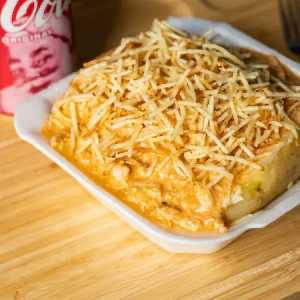 Batata, frango desfiado, chadder, mussarela, requeijão, e batata palha
