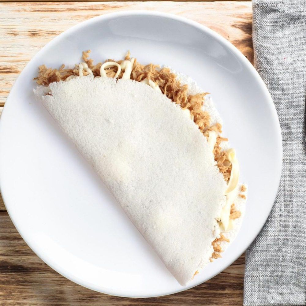 Tapioca recheada com frango desfiado e cremoso Catupiry, perfeita para um lanche rápido.