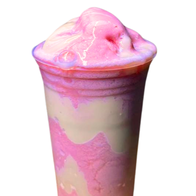 Milkshake Morango, Borda de Leite Ninho, Mais Calda de Morango, para um Sabor Doce e Refrescante.