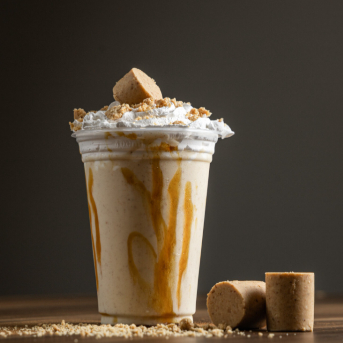 Milkshake Paçoca, Borda de Doce de Leite com Paçoca, Calda de Caramelo, Finalizado com Mais Paçoca para um Sabor Clássico e Irresistível.