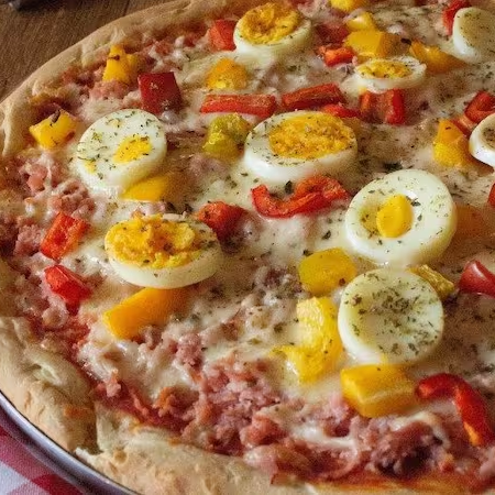 Molho, Muçarela, Presunto, Ovos, Ervilha, Tomate, Azeitona e Orégano.