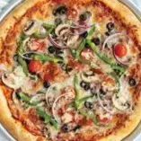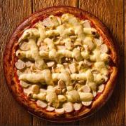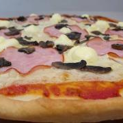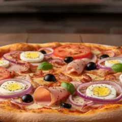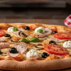 Molho, Muçarela, Peito de Peru Defumado, Champignon, Catupiry, Tomate, Azeitona e Orégano.