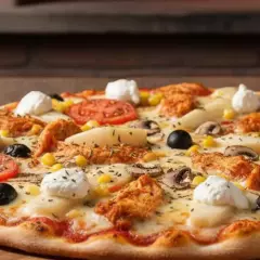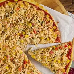Molho, Muçarela, Frango Desfiado, Milho, Cebola, Tomate, Azeitona e Orégano.