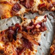 Molho, Muçarela, Frango Desfiado, Bacon, Cebola, Tomate, Azeitona e Orégano.