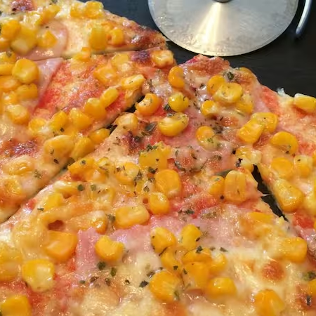 Molho, Muçarela, Presunto, Milho, Tomate, Azeitona e Orégano.
