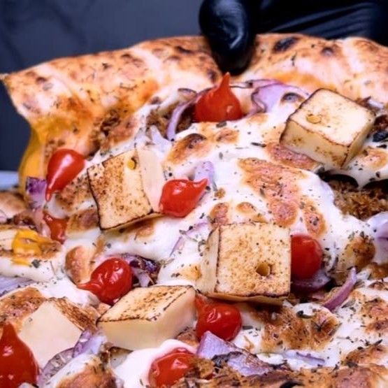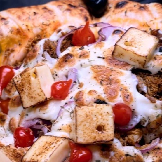 Molho especial, mussarela, carne desfiada, manteiga do sertão, queijo coalho, catupiry, banana da terra frita, cebola roxa, pimenta biquinho e orégano.