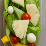 Salada Tropical | Combinação leve e refrescante de alface, rúcula, tomate cereja, manga, abacaxi e mussarela de búfala. Uma explosão de cores e sabores naturais no seu prato