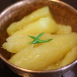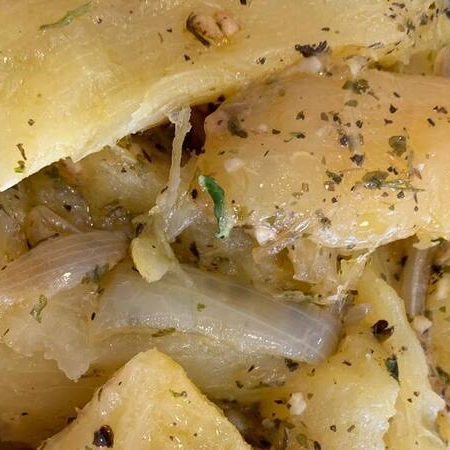 Mandioca cozida salteada na manteiga de garrafa, temperada com ervas finas.