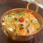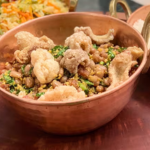 Farofa especial(farinha de mandioca, costelinha suína, bacon, cenoura, uva passa e cebolinha). (300g