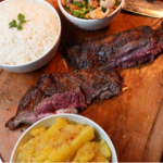 Fraldinha Assada + 3 Acompanhamentos Carne Pesada já assada. Acompanhamentos Fixos: Salpicão - 300g Feijão Tropeiro - 300g ️Acompanhamento à sua escolha (escolher 1): Mandioca Cozida ou Arroz Branco ( aproximadamente 500g) Serve 2 pessoas (300g)