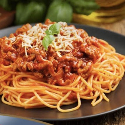 Macarrão espaguete com molho vermelho,carne moída,queijo ralado e azeitona.