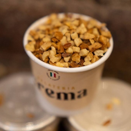 3 sabores de sorvete a escolha, flocos de arroz, borda de Nutella, castanhas de cajú, calda de chocolate e chantilly.