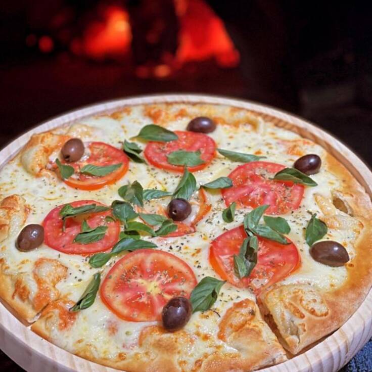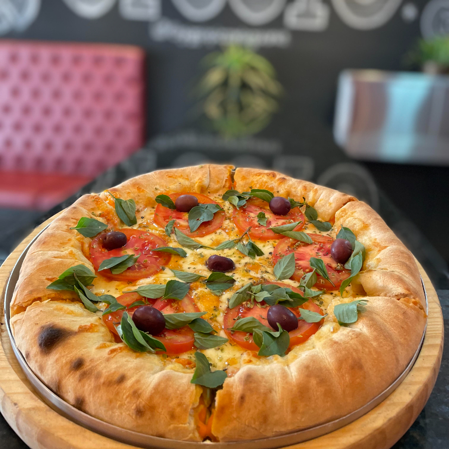 Massa fresca, molho artesanal, mussarela, tomate e manjericão