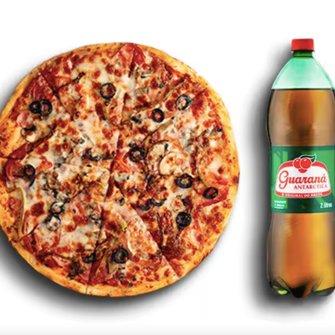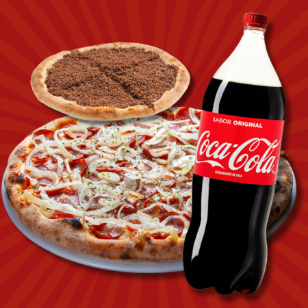 Pizza Grande 2 sabores + pizza brotinho doce + refrigerante 2l.