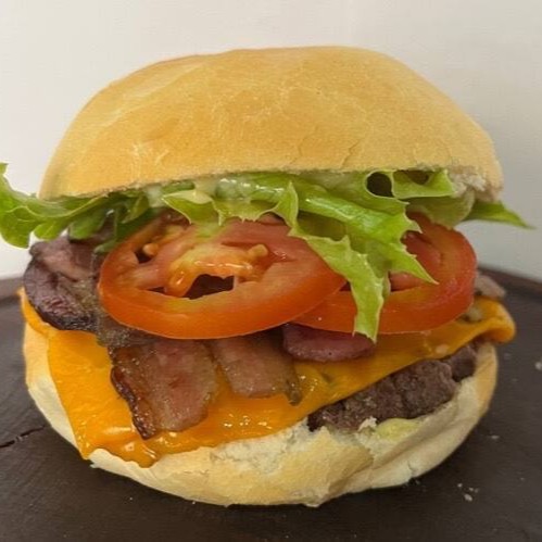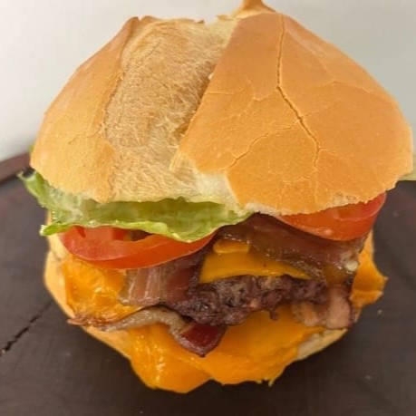Pão francês, 2 hambúrgueres, queijo cheddar, bacon, alface, tomate, molho caseiro tradicional.