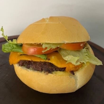 Pão francês, 1 hambúrguer, queijo cheddar, alface, tomate, molho caseiro tradicional.