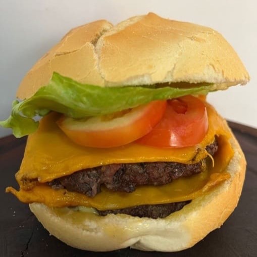 Pão francês, 2 hambúrgueres, queijo cheddar, alface, tomate, molho caseiro tradicional.