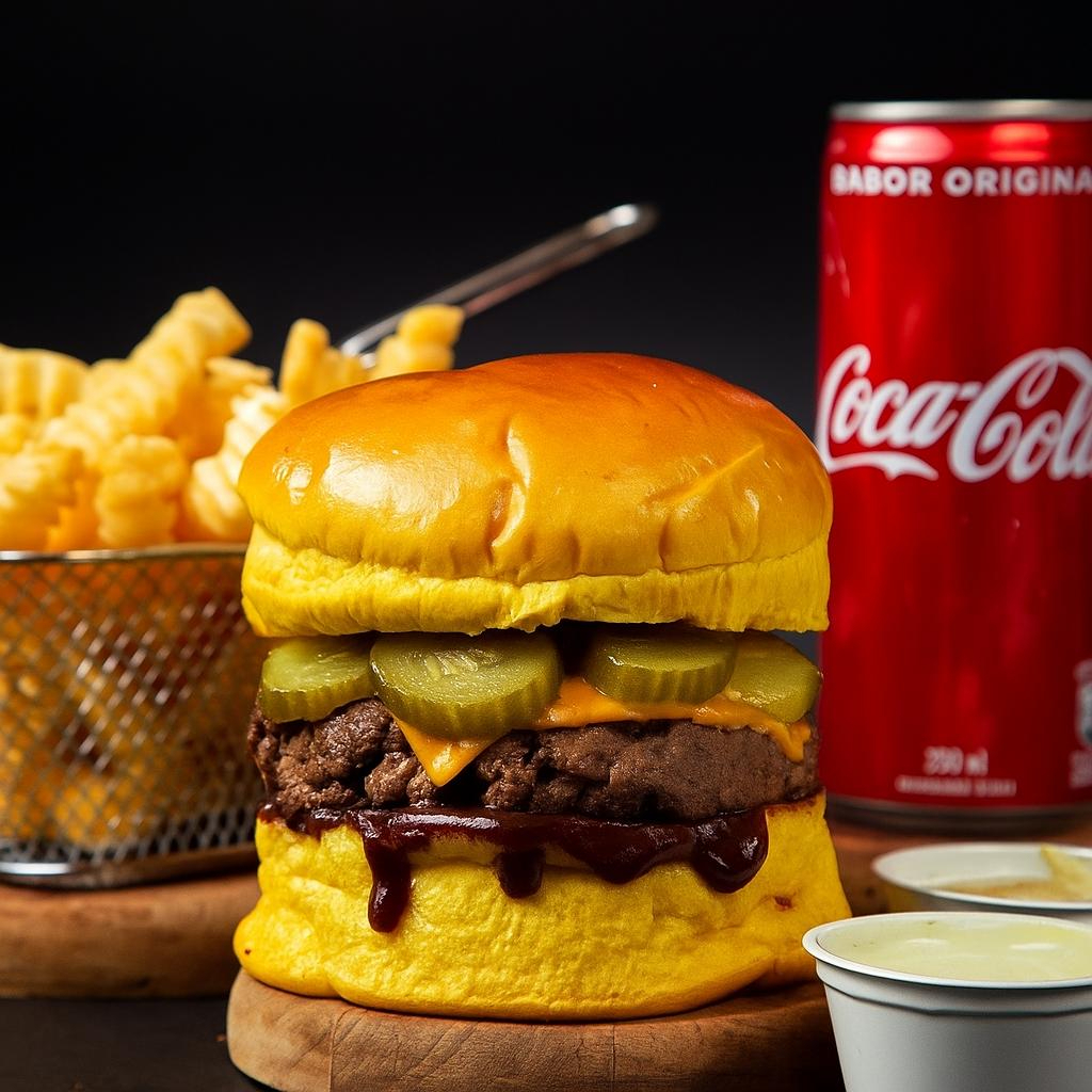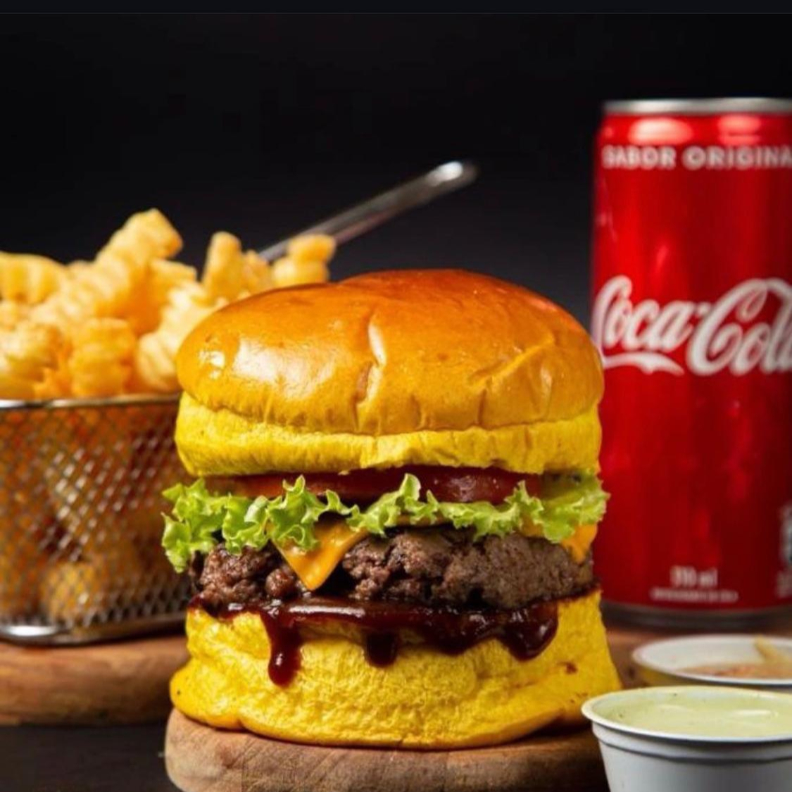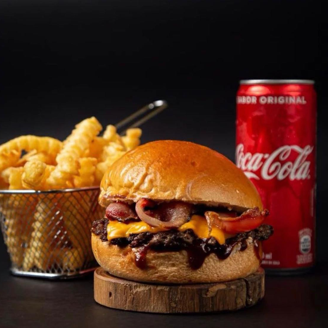 Leva um delicioso pão selado na manteiga, hambúrguer artesanal feito de carnes frescas de 120g, queijo cheddar e bacon crocante. + batata frita de 150g in nature + refrigerante (leva 2 molhos separadamente)