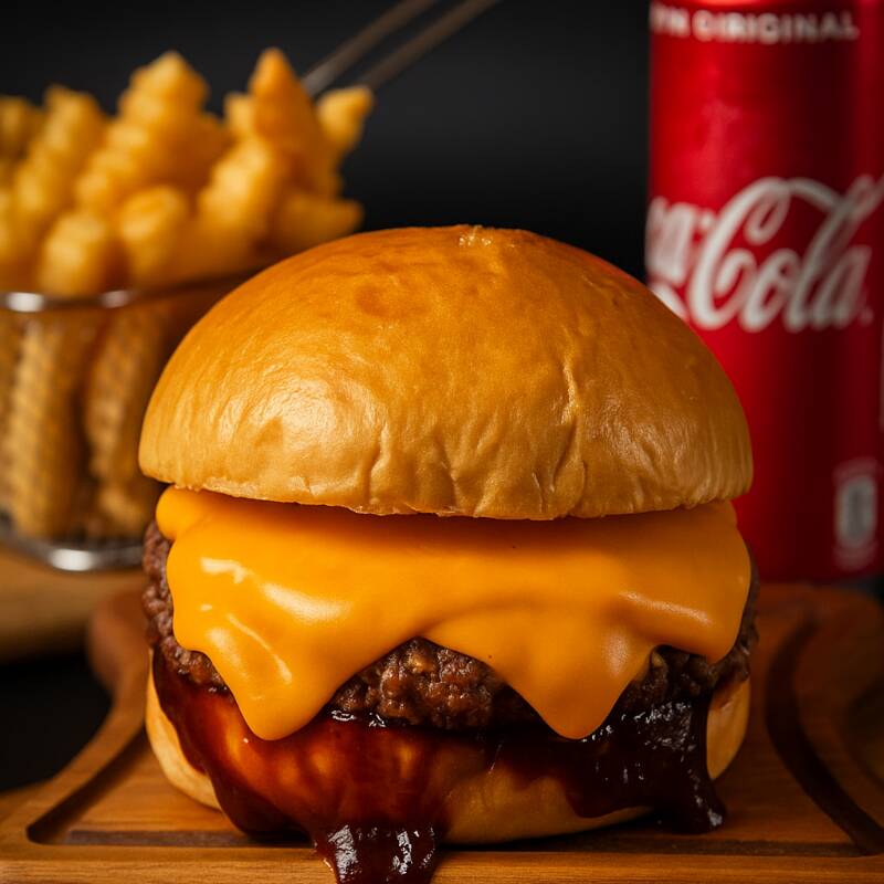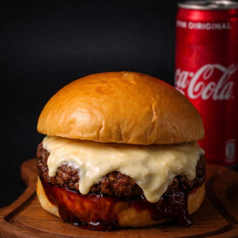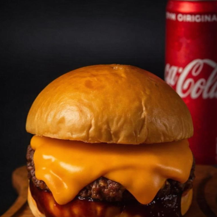 Leva um delicioso pão selado na manteiga, hambúguer de 120g e 3 fatias de cheddar + refrigerante .( Leva molho separadamente )