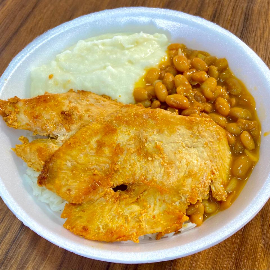 Arroz, Feijão, Purê de Batata e Filezinho de Frango.