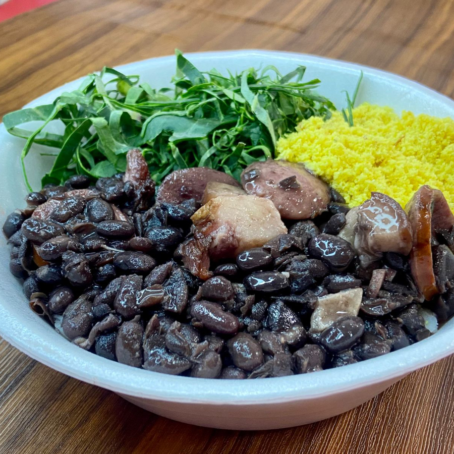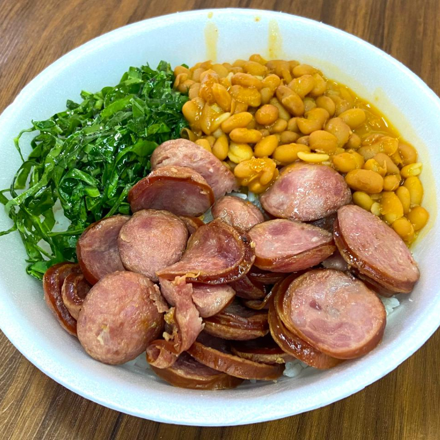 Arroz, Feijão, Couve Refogada e Calabressa.