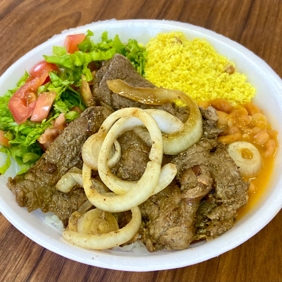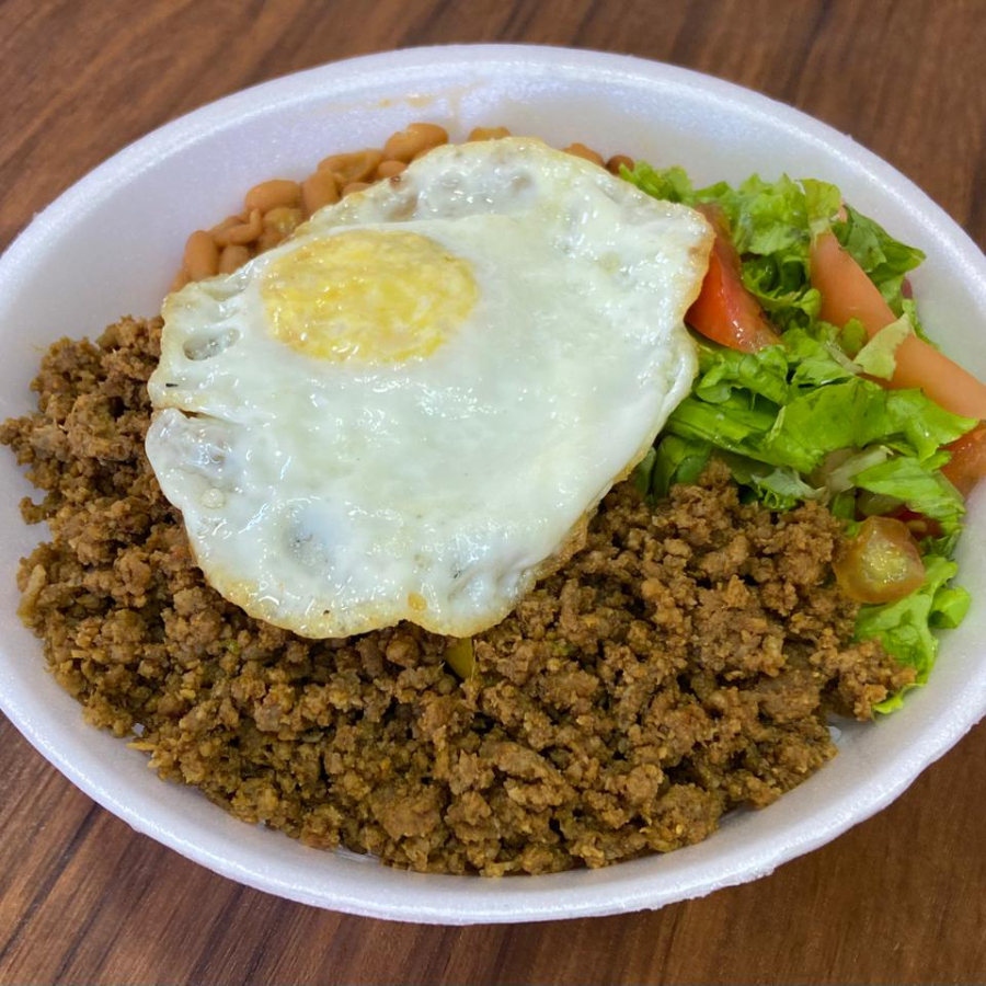 Arroz Branco, Feijão, Ovo Frito e Picadinho de Carne Moida.
