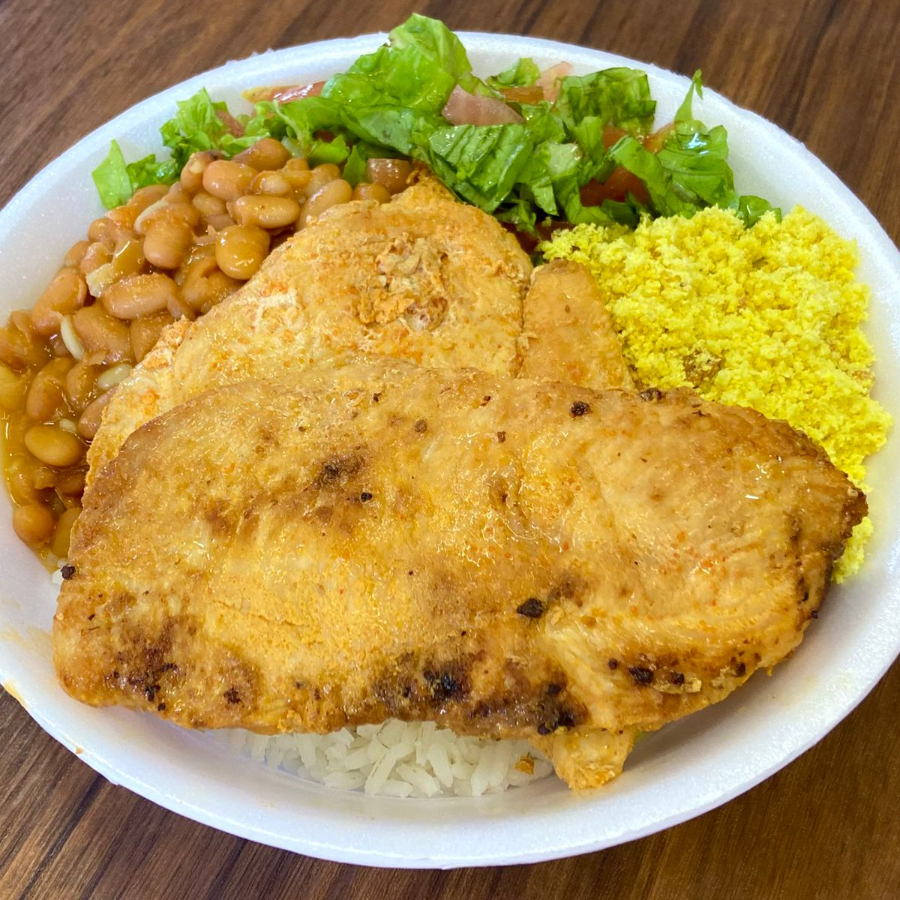 Arroz, Feijao, Salada, Farofa e Filezinho de Frango.