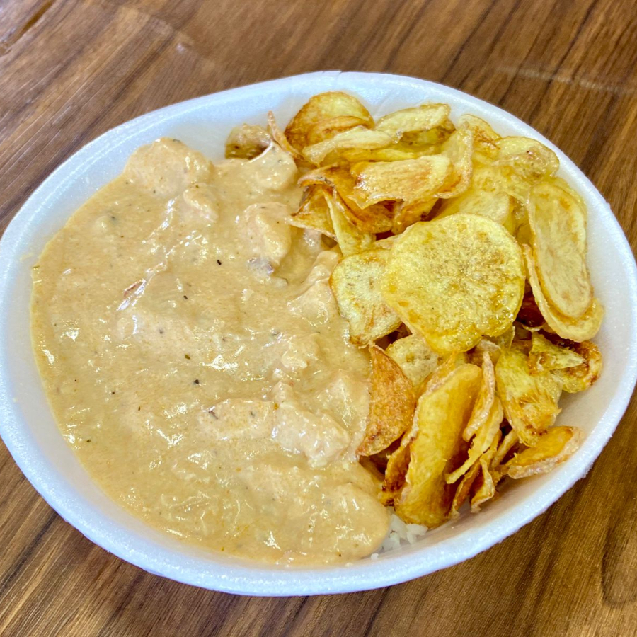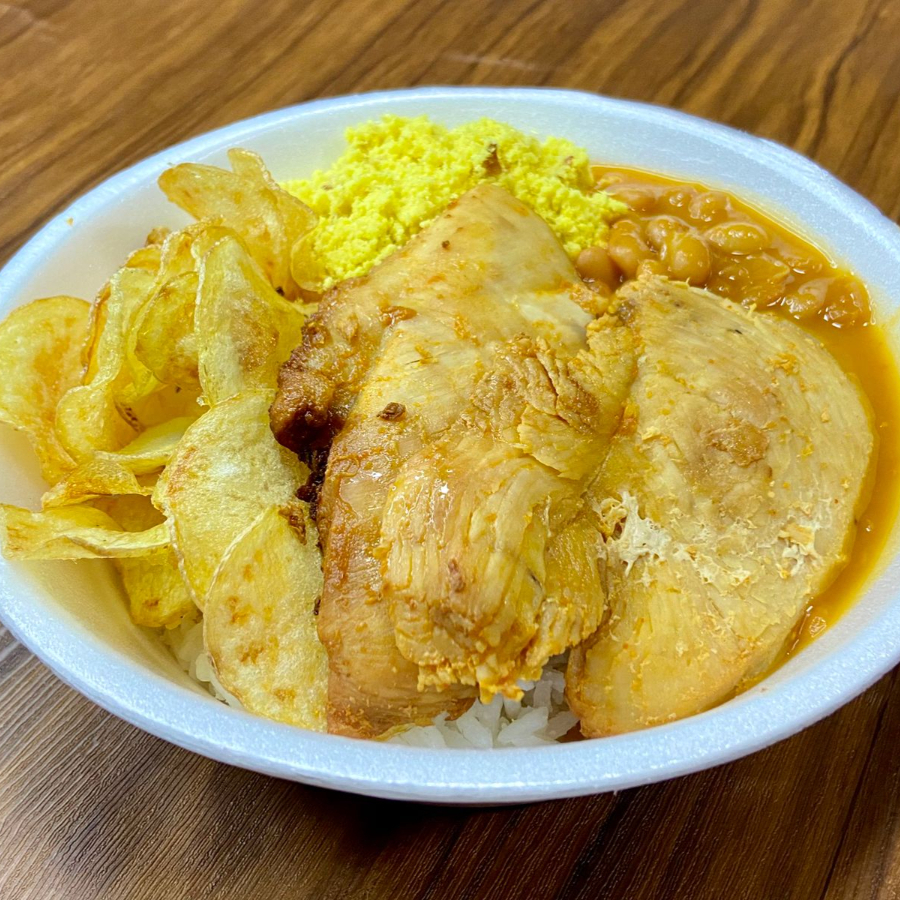 Filezinho de Frango, Batata Chips, Arroz, Feijão e Farofa.